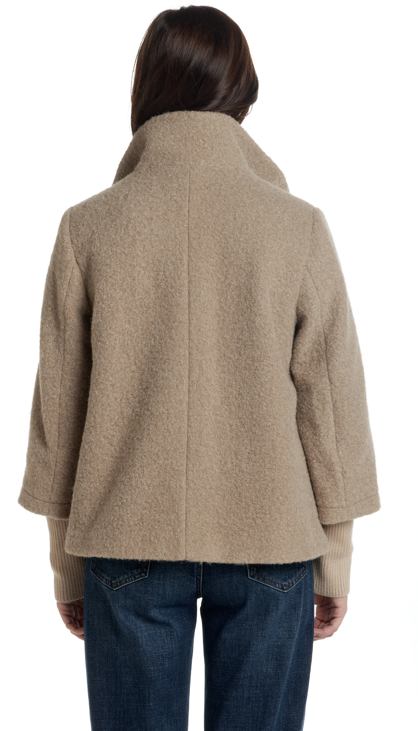 Elevate your style with this poly boucle topper, showcasing soft knit sleeves and a sophisticated stand collar. The hidden snap closure creates a smooth, effortless finish, making this a standout piece that’s both comfortable and chic.
