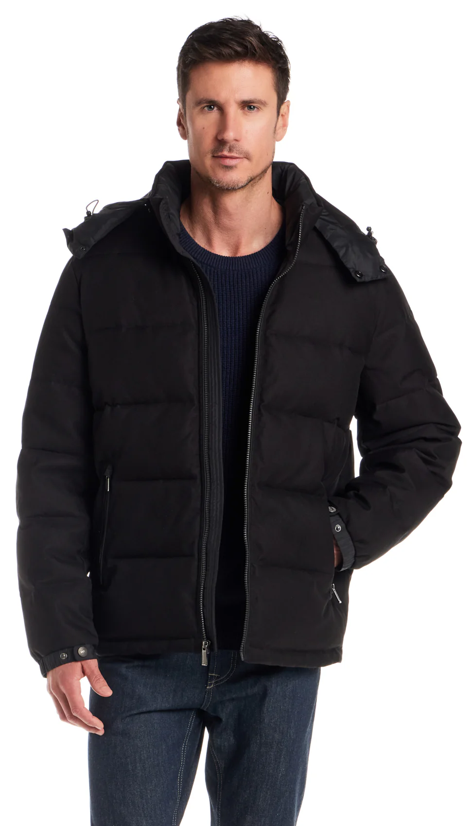 - Quilted Puffer.Removable zippered hood with chin guard and snap closureS